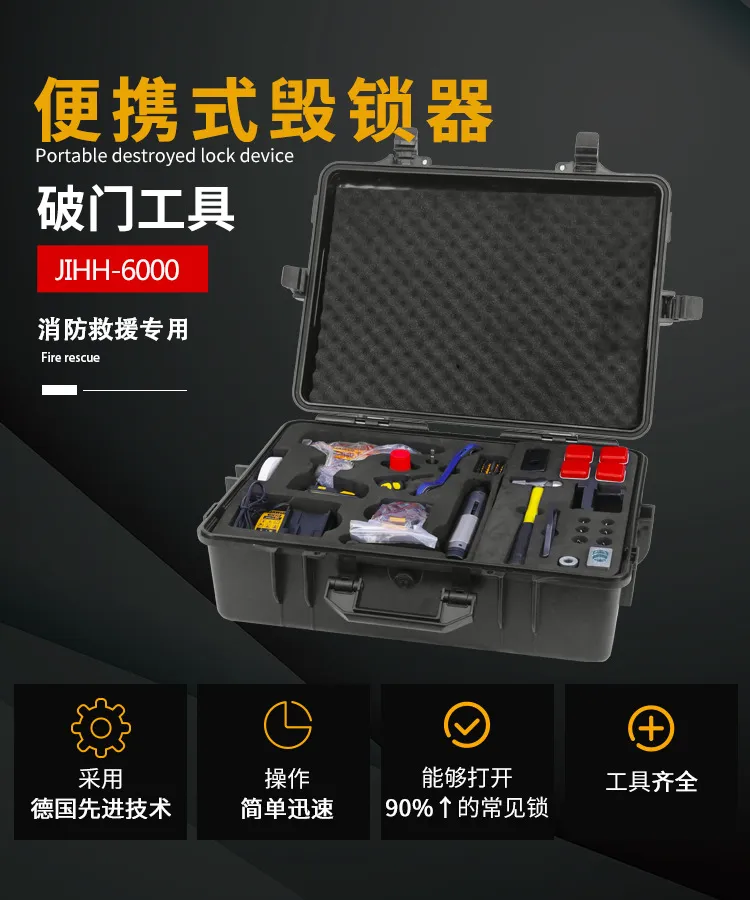配置:专用特种钻头螺丝,锁芯拔除器、锁芯切断器、换向扳手、专用电钻、电池、充电器、锁舌转动器、除锈润滑剂、辅助工具、可锁防水防尘塑料箱。